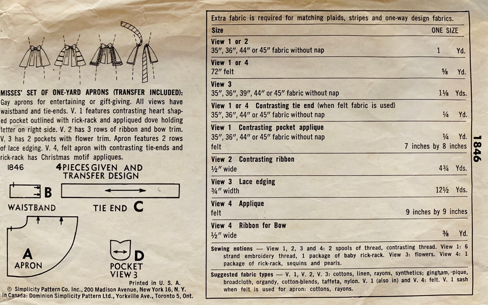 This is an original printed pattern. It remains unused. Set of One-Yard Aprons (Transfer Included): Gay aprons for entertaining or gift-giving. All views have waistband and tie-ends. V1 features contrasting heart-shaped pocket outlined with rick-rack & appliqued dove holding letter on right side. V2 has 3 rows of ribbon and bow trim. V3 has 2 pockets with flower trim. Apron features 2 rows of lace edging. V4, felt apron with contrasting tie-ends & rick-rack has Christmas motif appliques.