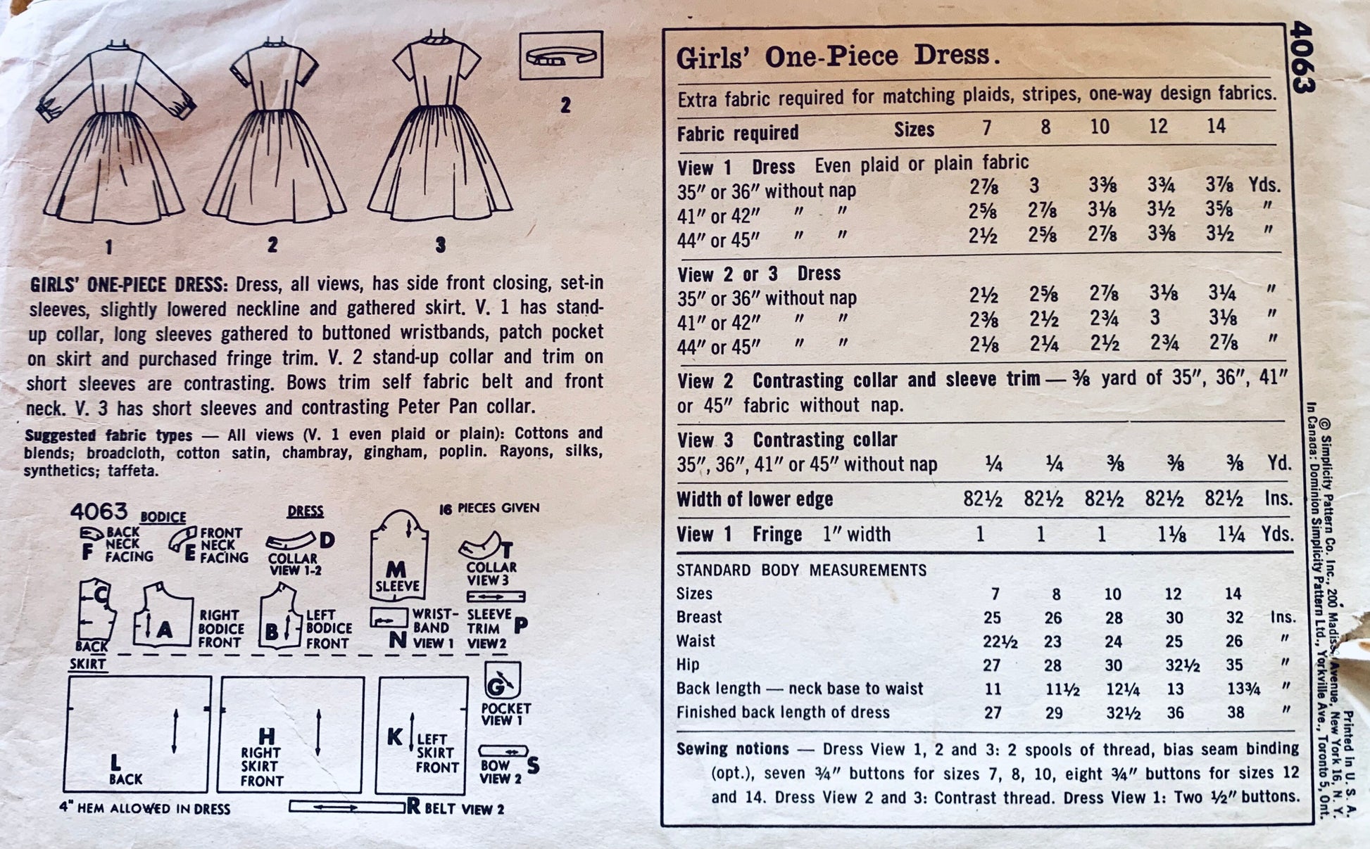 This is an original printed sewing pattern. It has been previously used but is complete. Dress, all views, has side front closing, set-in sleeves, slightly lowered neckline and gathered skirt. V. 1. has stand-up collar, long sleeves gathered to buttoned wristbands, patch pocket on skirt and purchased fringe trim. V. 2. stand-up collar and trim on short sleeves are contrasting. Bows trim self fabric belt and front neck. V. 3. has short sleeves and contrasting Peter Pan collar.