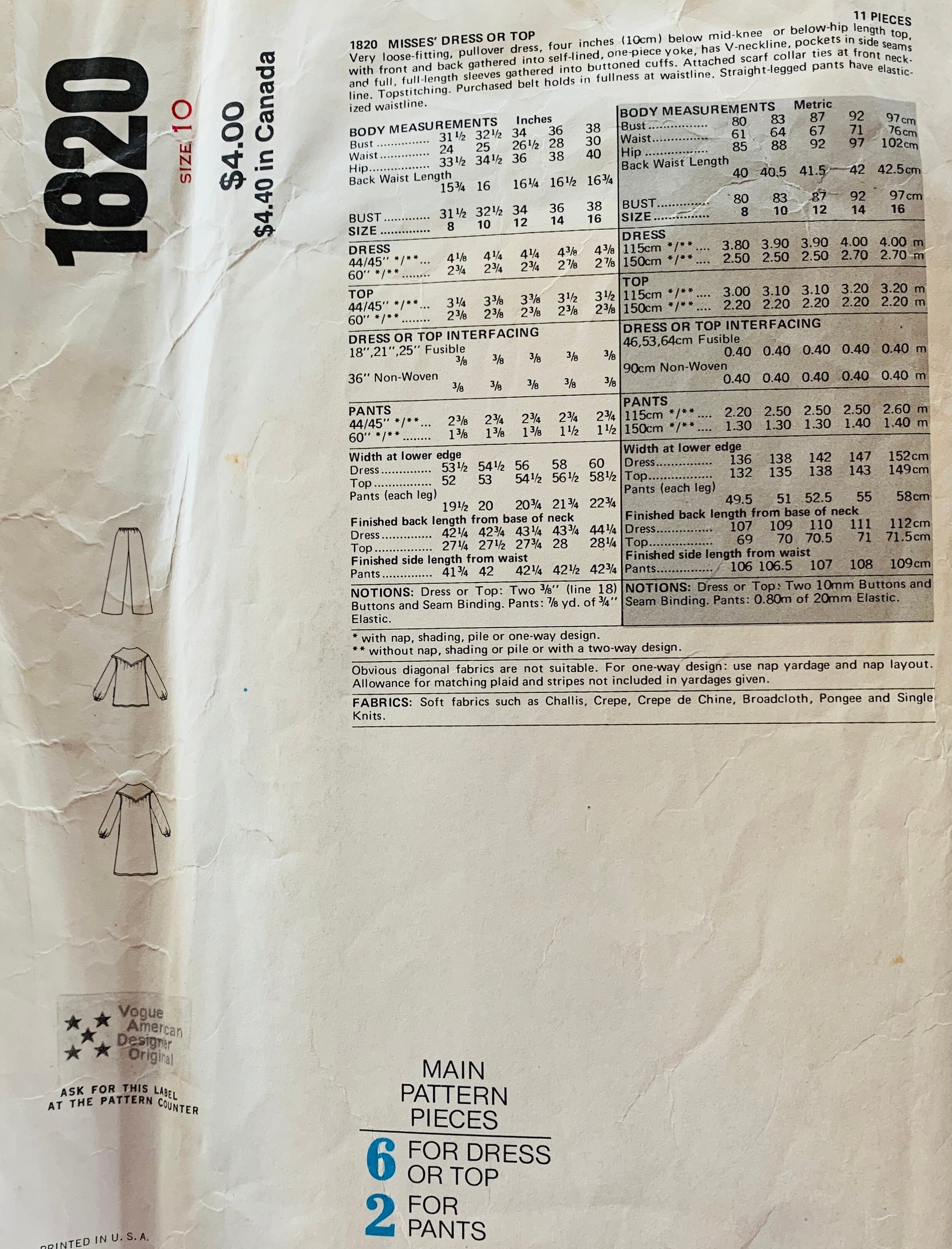 This is an original printed pattern. It has been previously used but is complete. Dress or Top: Very loose-fitting, pullover dress, four inches below mid-knee or below-hip length top, with front & back gathered into self-lined, one-piece yoke, has V neckline, pockets in side seams & full, full-length sleeves gathered into buttoned cuffs. Attached scarf collar ties at front neckline. Topstitching. Purchased belt holds in fullness at waistline. Straight-legged pants have elasticized waistline.