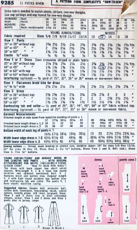 This is an original printed sewing pattern. It has been previously used but is complete. Young Junior/Teens' and Misses' Dress in Two Lengths and Pants ... with Special Stitching line for Knits: (Including a Tissue Lesson Chart ... "How to Work with Knits"). The dress with back zipper has short set-in sleeves. Mini-length V. 1 & 2 have low round neckline and optional purchased belt. V. 1 features braid and button trim. Regular length V. 3 with high round neckline has button trim and contrasting tab and collar. The pants V. 1 have elastic waistline casing.