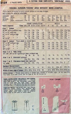 This is an original printed pattern. It has been previously used but is complete with all pieces and instructions. Young Junior/Teens' and Misses' Mini-Jumper: (Including a Tissue Lesson-Chart ... "How to Work with Plaids"). The mini-jumper softly gathered to lined yoke has back zipper, squared neckline, set-in cap sleeves and optional rick-rack and braid trim. V. 2 features bias yoke and sleeves.