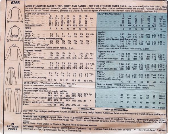 This is an original printed sewing pattern. It is uncut. Misses' Unlined Jacket, Top, Skirt and Pants - Top for Stretch Knits Only: Unconstructed jacket has collar, patch pockets, sleeves gathered into cuffs; jacket has drawstring in waistline casing when buttons and buttonholes are omitted. Pullover top has cowl collar and tie belt. Flared, bias skirt, gathered into waistband has side zipper. Pants have released front tucks and zipper in front opening. 1978.