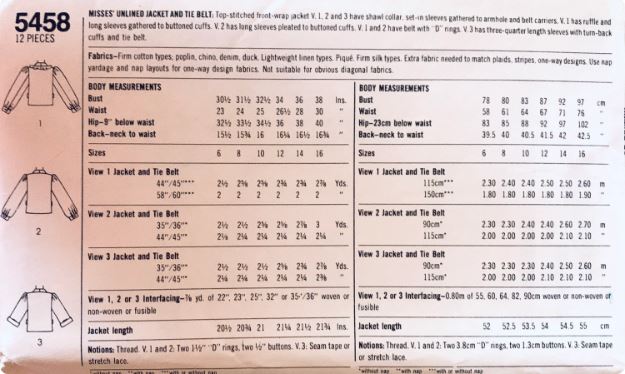 This is an original printed pattern. It remains in factory folds. Misses' Unlined Jacket and Tie Belt: Top-stitched front-wrap jacket. V 1, 2 and 3 have shawl collar, set-in sleeves gathered to armhole and belt carriers. V 1 has ruffle and long sleeves gathered to buttoned cuffs. V 2 has long sleeves pleated to buttoned cuffs. V 1 and 2 have belt with "D" rings. V 3 has three-quarter length sleeves with turn-back cuffs and tie belt.