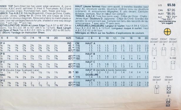 This is an original printed sewing pattern. It has been partially cut to the largest size but is complete. Misses' Top: Semi-fitted top has upper edge variations. A: cut in armholes. A, B, C and E: self lined. D: lined. E: front pleats. B, C, D and E: bias shoulder straps. Purchased belt, sash, flower and bow. 1988.