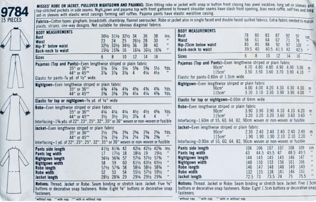 This is an original unprinted pattern. It is uncut. Misses' Robe or Jacket, Pullover Nightgown and Pajamas: Slim-fitting robe or jacket with snap or button front closing has jewel neckline, long set-in sleeves and top-stitched pockets in side seams. Nightgown and pajama top with front gathered to forward shoulder seams have slash front opening, bias neck ruffle, self ties and long set-in sleeves with elastic wrist casings forming self ruffles. Pajama pants have elastic waistline casing. 1980.